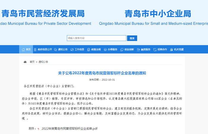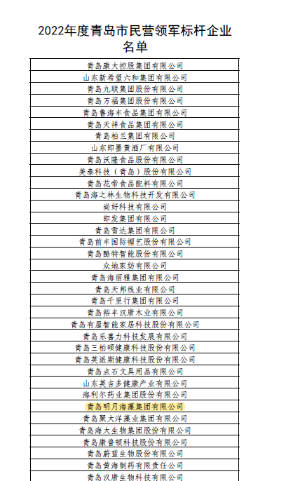 日前,青島市民營經(jīng)濟(jì)(中小企業(yè))發(fā)展工作領(lǐng)導(dǎo)小組辦公室公布了2022年度青島市民營領(lǐng)軍標(biāo)桿企業(yè)名單,這是青島首次評選民營領(lǐng)軍標(biāo)桿企業(yè)。青島明月海藻集團(tuán)光榮上榜,成為“2022年度青島市民營領(lǐng)軍標(biāo)桿企業(yè)”。