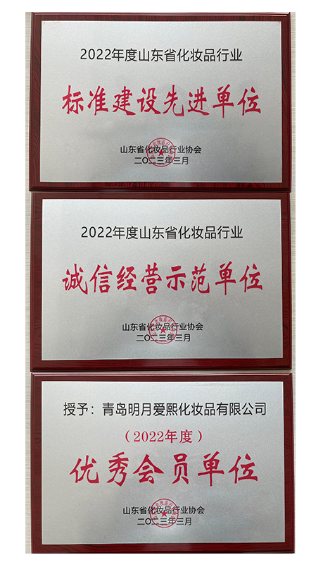 在本次大會(huì)上,青島明月愛熙化妝品有限公司斬獲“標(biāo)準(zhǔn)建設(shè)先進(jìn)單位”、“誠(chéng)信經(jīng)營(yíng)示范單位”、“優(yōu)秀會(huì)員單位”三項(xiàng)殊榮。