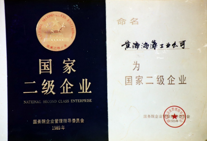 1988年,公司相繼獲得農業部設備管理優秀單位獎、生產節能先進集體和全面質量管理獎。1989年,黃海海藻工業公司被評為國家二級企業。