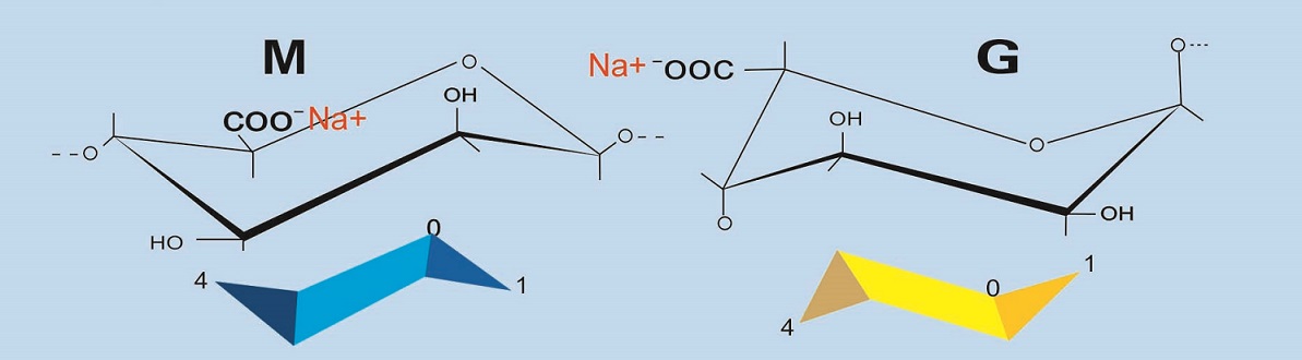 海藻酸鹽是存在于海帶、巨藻等褐藻中的一種天然多糖類物質(zhì),是藻體中的海藻酸與海水中的礦物質(zhì)生成的天然產(chǎn)物,海藻酸是由甘露糖醛酸(M)和古洛糖醛酸(G)組成的混聚多糖。應(yīng)用廣泛的海藻酸鹽產(chǎn)品主要有海藻酸鈉、海藻酸鉀、海藻酸鈣、海藻酸銨等。