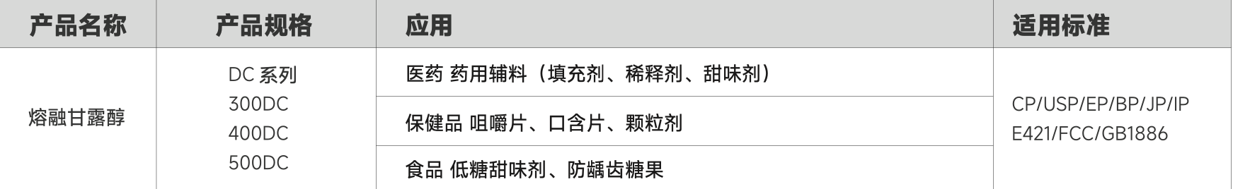 熔融制粒甘露醇是通過熔融制粒工藝制備的甘露醇顆粒,具有良 好的流動性、壓縮性和顆粒均勻性,適用于對壓片性能要求較高 的制劑工藝。該系列產品特別適用于口崩片、咀嚼片、速釋片等 固體制劑的制備。